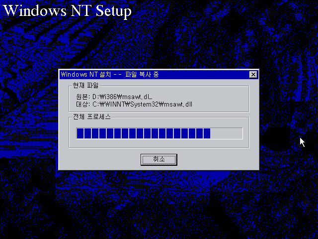 윈도우 NT 계열의 특징인 블루스크린 부팅화면이 나옵니다.