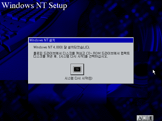 윈도우 NT 4.0 설치가 끝났습니다. 시스템 다시 시작을 누릅니다.