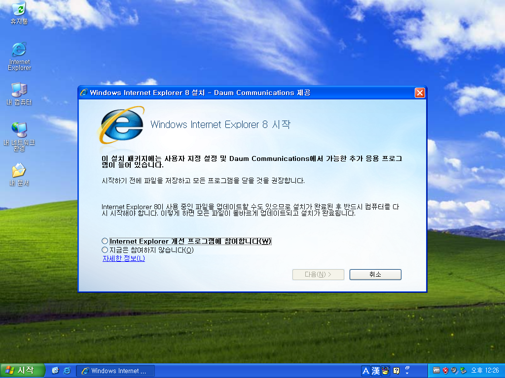 윈도우 XP용 인터넷 익스플로러 8 다음 최적화 버전입니다. 빌드 넘버는 8.0.6001.18702CO입니다. 일반 버전과의 차이점은 다음이 시작페이지로 설정된다는 점입니다. 16.4MB 설치 파일입니다.