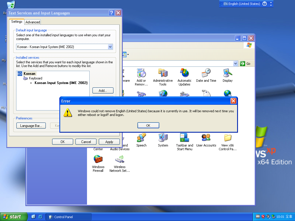 일단 영문판으로써의 설치는 완료되었습니다. 겉으로 보기엔 그냥 일반적인 영문판 윈도우 XP 같습니다. 다만 배경화면의 윈도우 로고에도 64비트 에디션이라고 쓰여있네요.