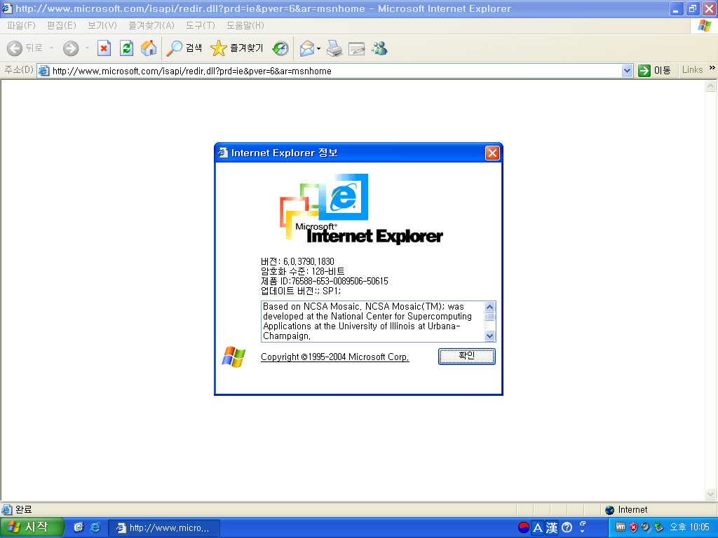 인터넷 익스플로러입니다. 버전 6.0이고, 빌드 넘버는 6.0.3790.1830입니다.