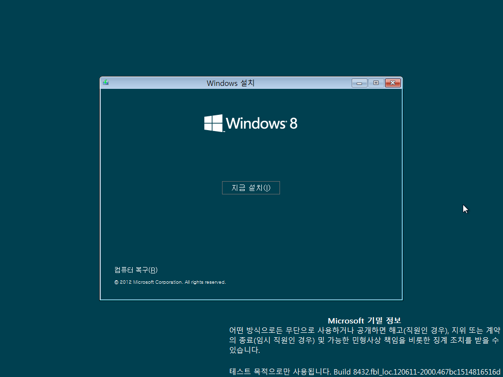윈도우 8 빌드 8432 설치를 시작합니다. 다음을 누릅니다. 밑에 문구가 무섭네요.