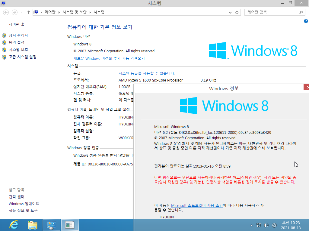시스템 등록 정보입니다. 윈도우 8 빌드 8432입니다. 빌드 넘버는 6.2.8432입니다. 여기도 경고 문구가 빨간색으로 뜹니다.
