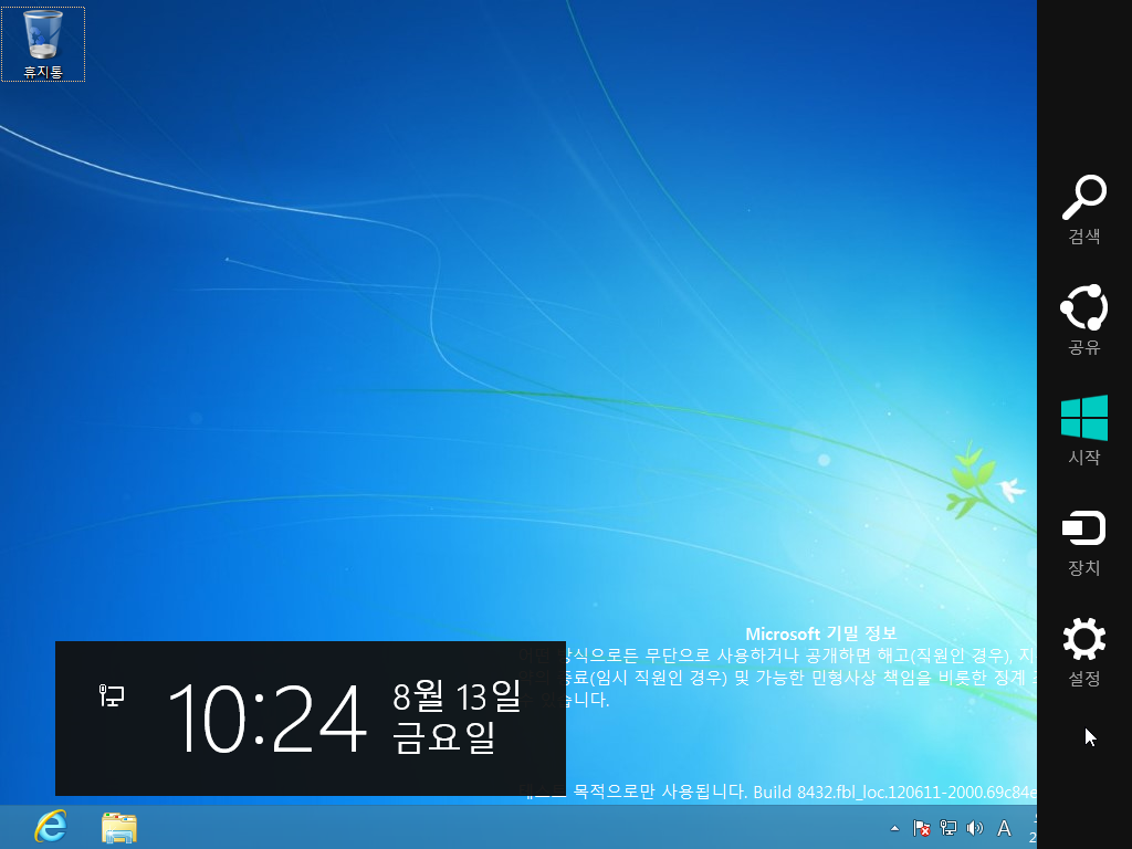 바탕화면입니다. 윈도우 7의 기본 배경화면에서 윈도우 로고만 사라진 화면입니다. 아직까지는 윈도우 7의 흔적이 남아있네요. 우측 하단에는 빌드 8432, 테스트 목적이라는 문구와 함께 무단 사용 시 해고 및 민형사상 책임을 묻는다는 무시무시한 문구가 있습니다.. 그래도 유출이 되었네요.