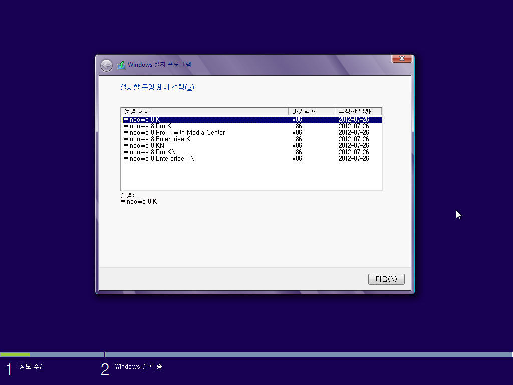 설치할 에디션을 선택합니다. 윈도우 8 K를 선택합니다.