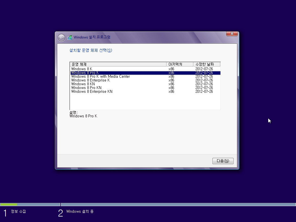 설치할 에디션을 선택합니다. 윈도우 8 프로 K를 선택합니다.