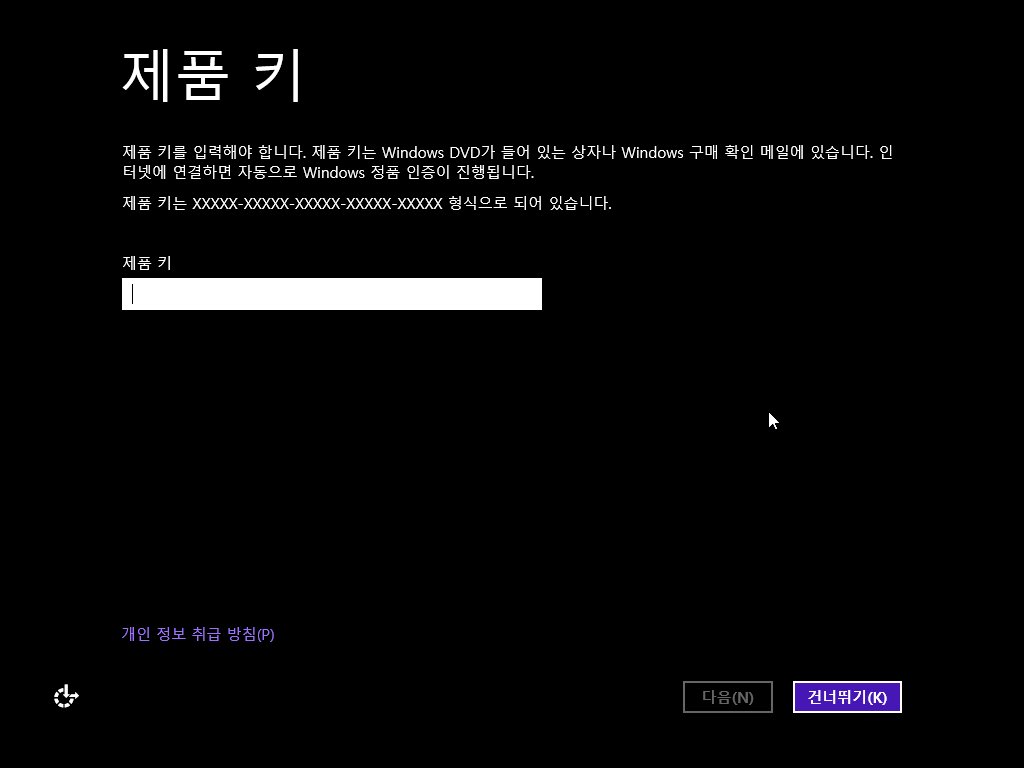 제품 키를 입력합니다. 건너뛸 수 있습니다.