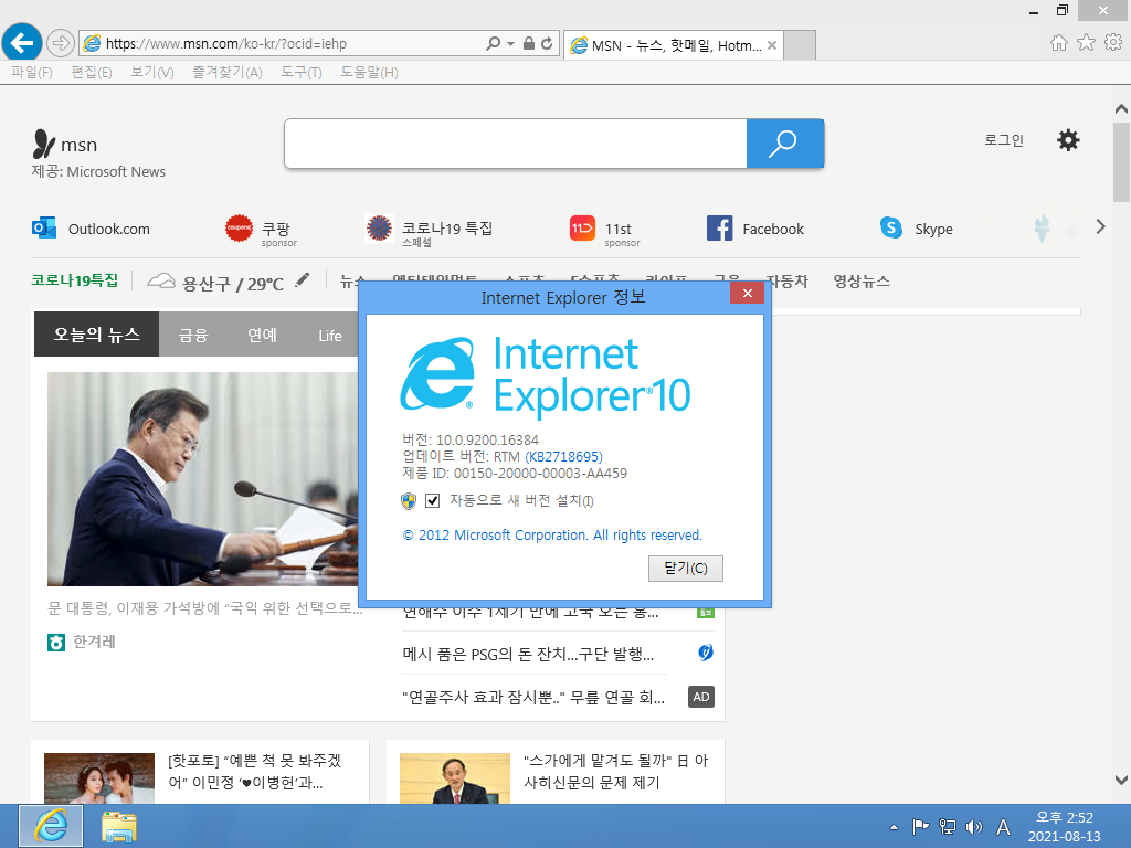 인터넷 익스플로러입니다. 버전 10.0이고, 빌드 넘버는 10.0.9200.16384입니다.