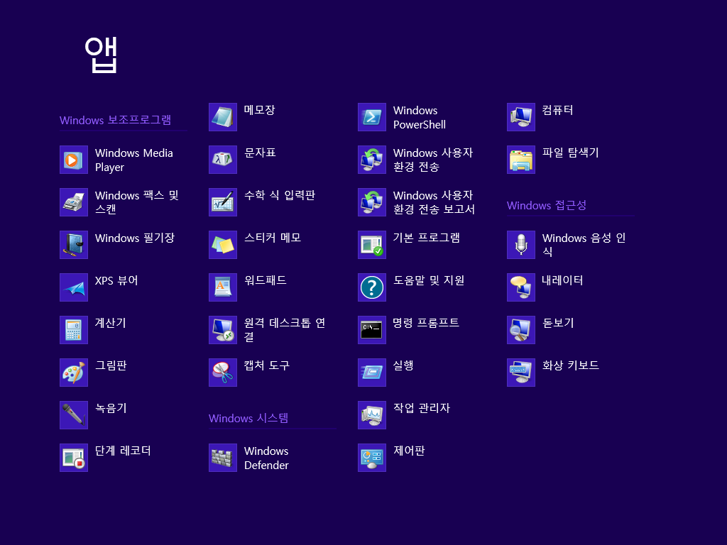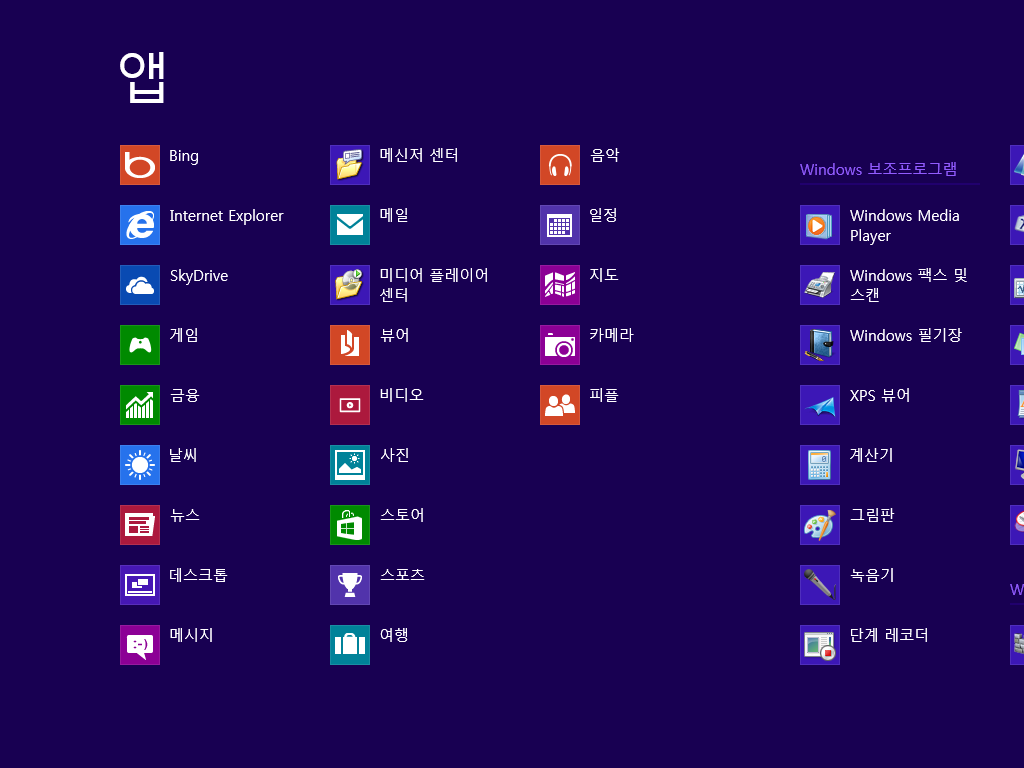 앱 목록입니다. 왼쪽에는 메트로 UI에서 사용할 수 있는 앱들이 있습니다.