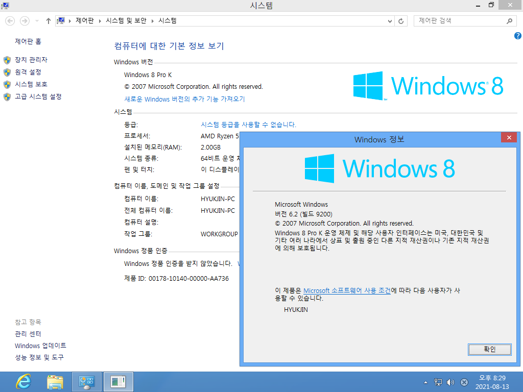 시스템 등록 정보입니다. 윈도우 8 프로 K입니다. 빌드 넘버는 6.2.9200입니다.