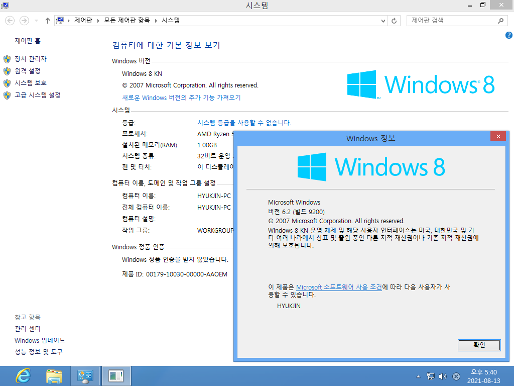 시스템 등록 정보입니다. 윈도우 8 KN입니다. 빌드 넘버는 6.2.9200입니다.