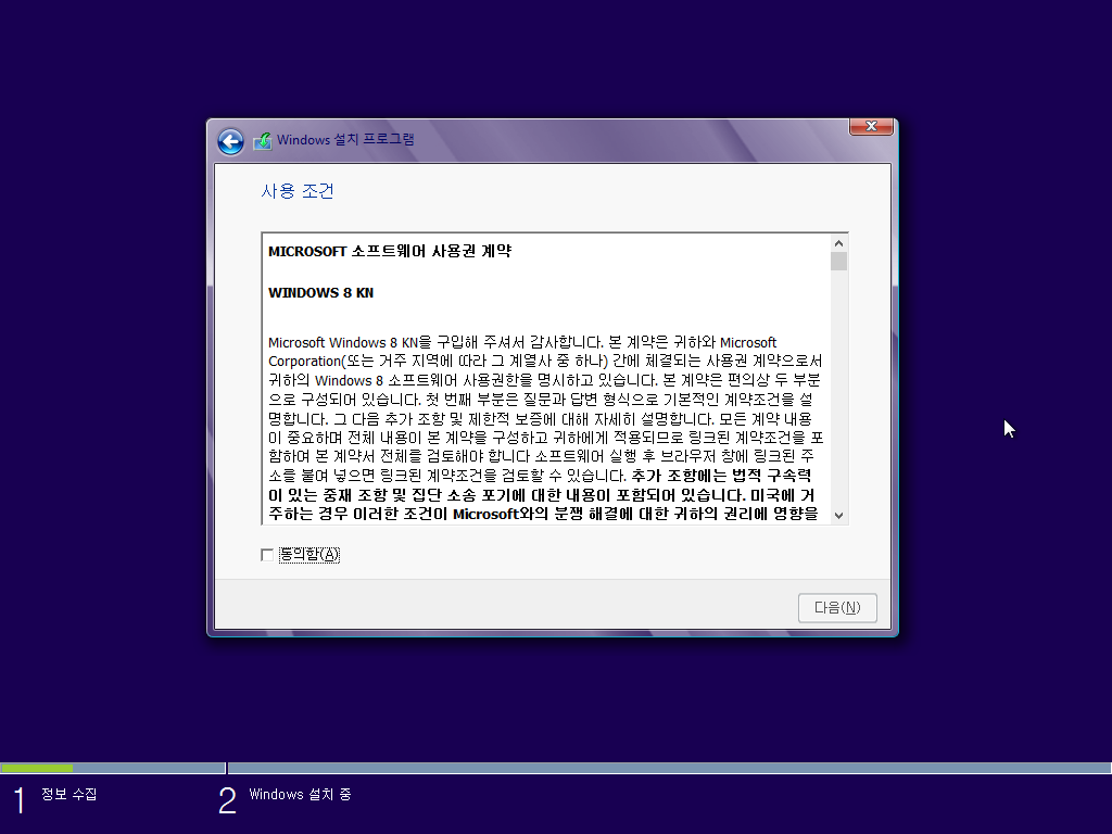 윈도우 8 설치를 시작합니다. 다음을 누릅니다.