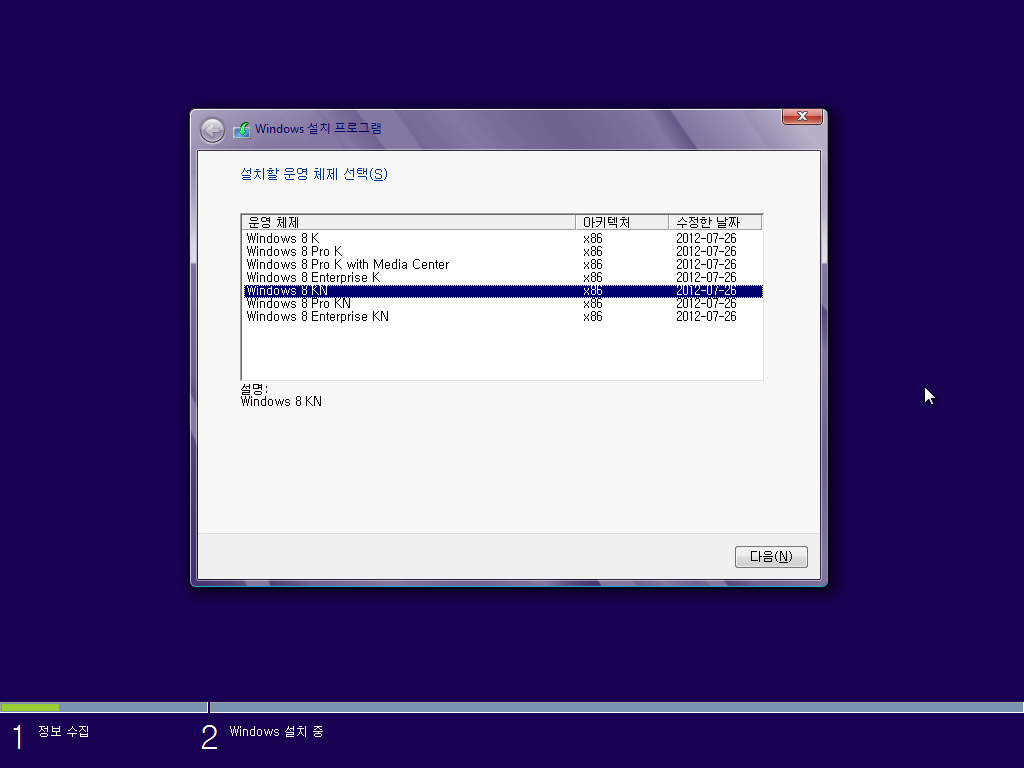 설치할 에디션을 선택합니다. 윈도우 8 KN을 선택합니다.