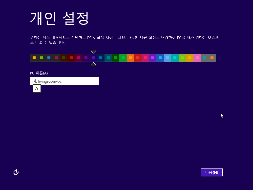 개인 설정입니다. 원하는 배경색과 PC 이름을 지정하고 다음을 누릅니다.