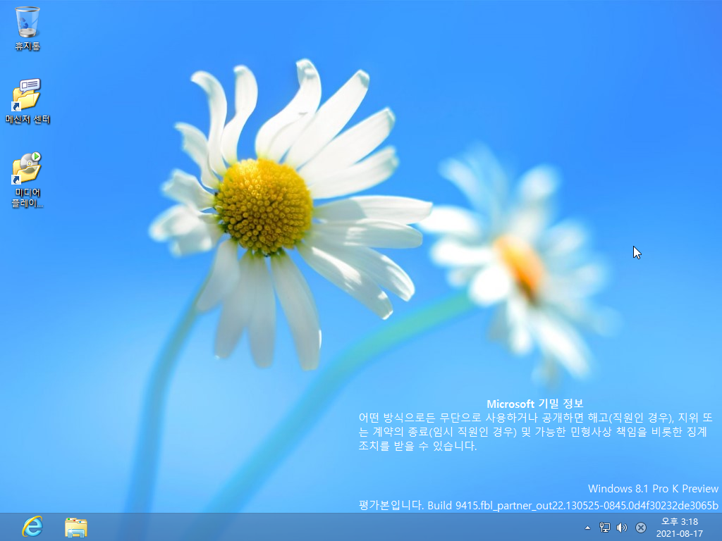 데스크톱 화면입니다. 아직 시작 버튼이 부활하지도 않았고, 배경화면도 윈도우 8의 배경화면입니다. 화면 우측 하단에는 윈도우 8.1 프로 K 프리뷰, 빌드 9415라는 문구와 함께 무단 사용 시 법적 책임을 묻는다는 문구가 있습니다.