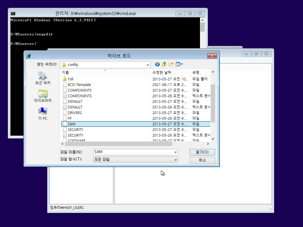 HKEY_USERS에 C:\Windows\System32\config\SAM 하이브를 로드합니다.
