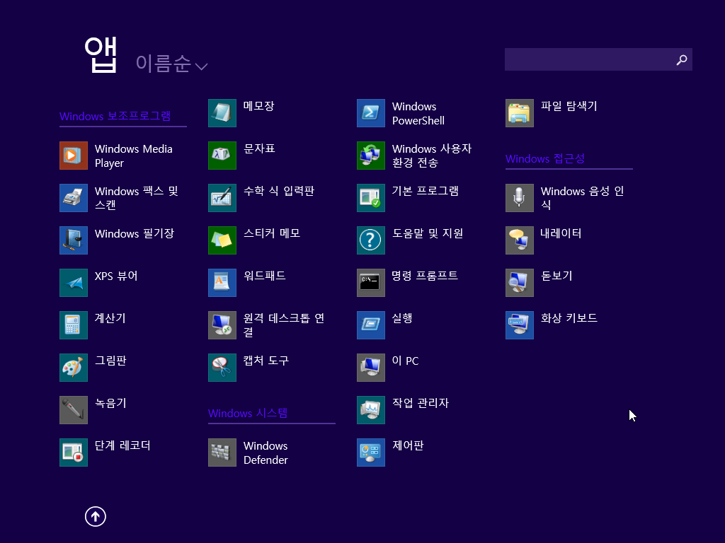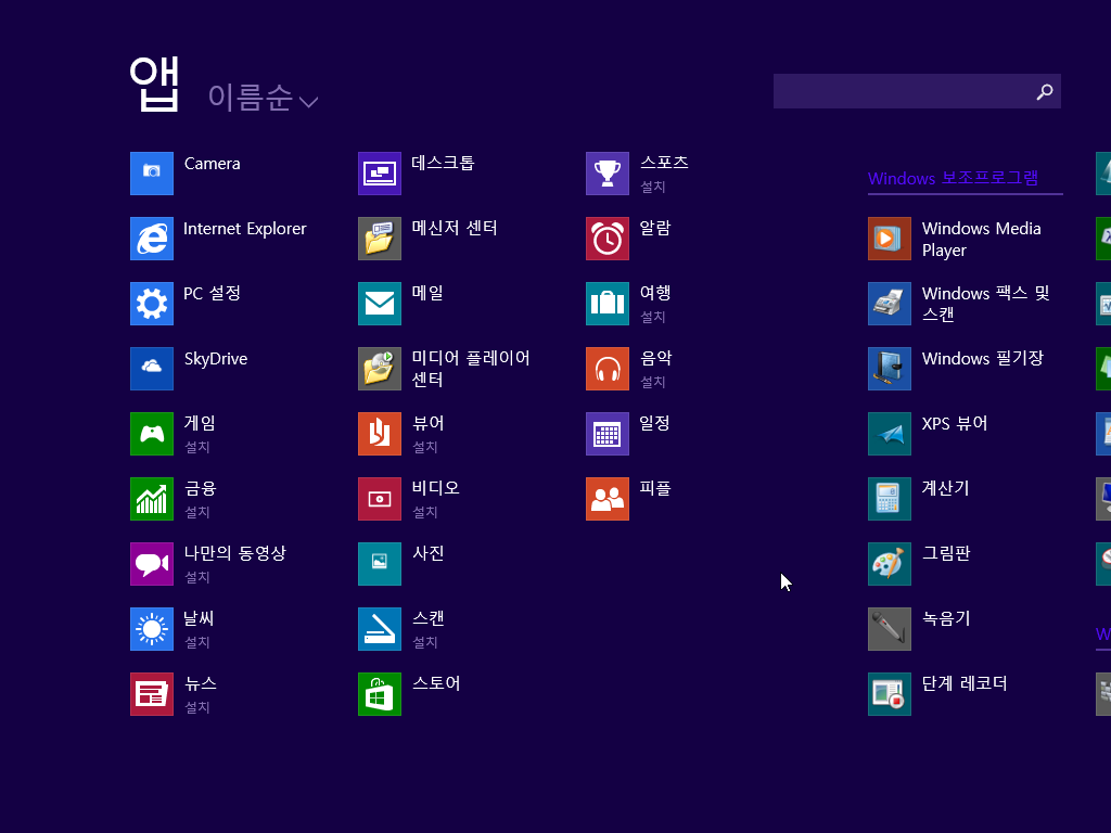 앱 목록입니다. 메트로 UI에서 사용할 수 있는 앱들인데, 앱 몇개의 아이콘 그림이 사각형보다 작네요. 버그인가 봅니다.