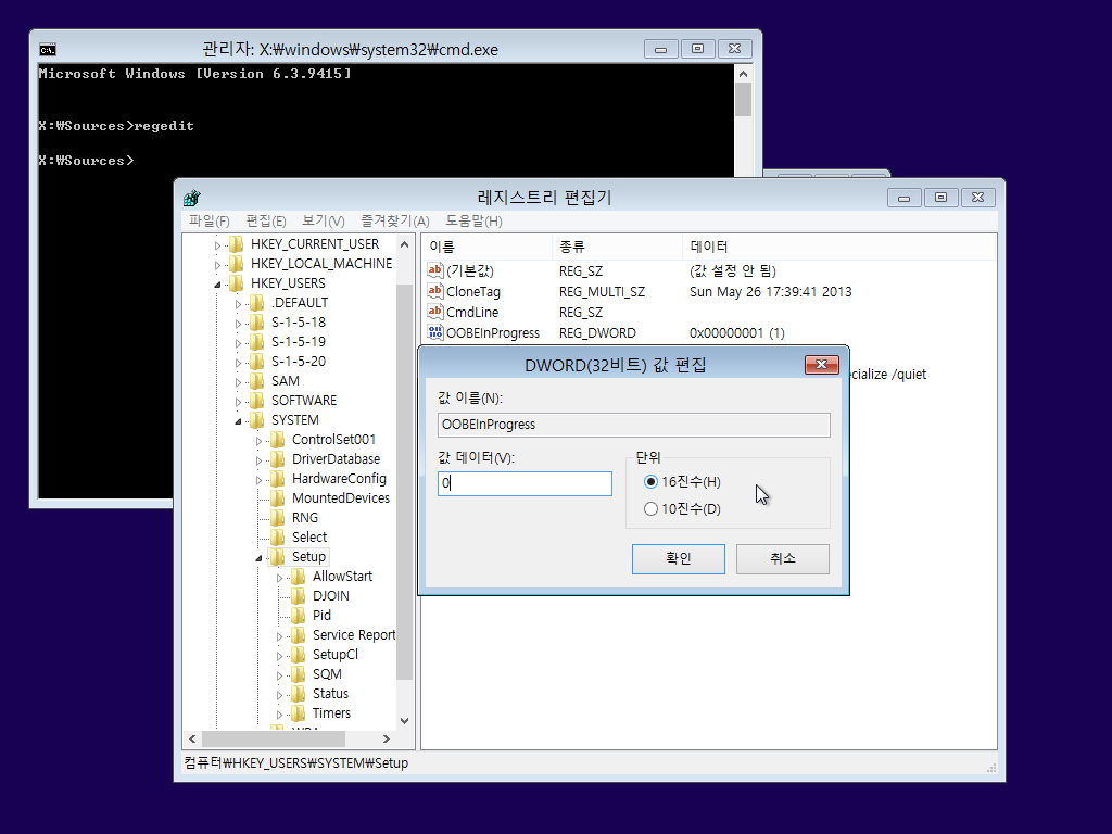 OOBEInProgress의 값을 0으로 바꾸어줍니다.
