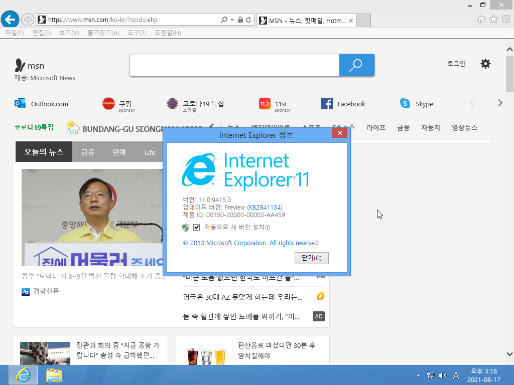 인터넷 익스플로러입니다. 버전 11.0이고, 빌드 넘버는 11.0.9415.0입니다. 프리뷰 버전입니다.