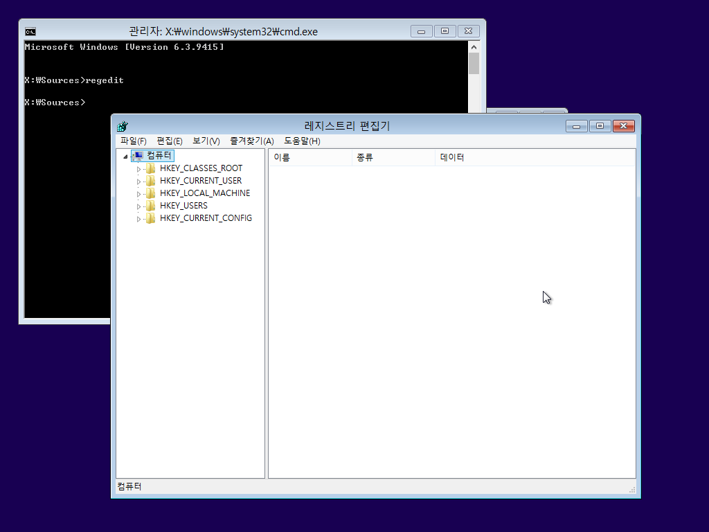 시스템을 재시작하여 CD에서 부팅한 다음 Shift + F10을 눌러 명령 프롬프트를 엽니다. 그 후 regedit을 입력하여 레디스트리 편집기를 엽니다.
