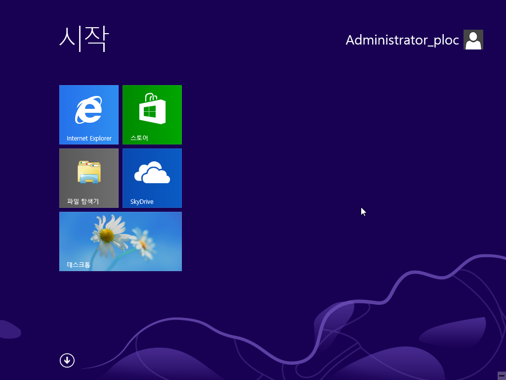 시작 화면입니다. 메트로 UI 스타일인데, 시작 화면에 띄워진 앱이 몇 개 없네요.