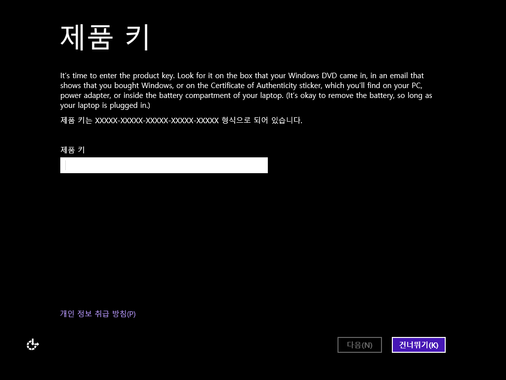 제품 키를 입력합니다. 한글화가 덜 되어서 영어로 나오는 모습입니다. 건너뛸 수도 있습니다.