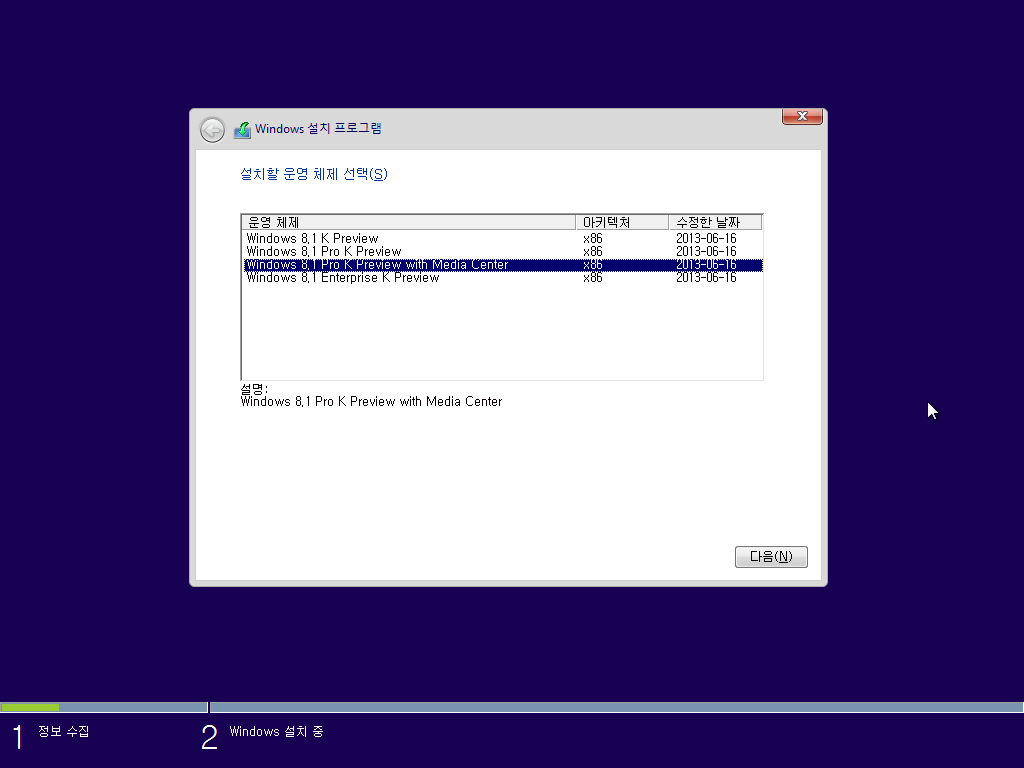 설치할 에디션을 선택합니다. 미디어 센터가 포함된 윈도우 8.1 프로 K 프리뷰를 선택합니다.
