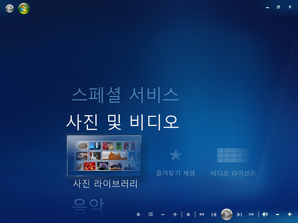 미디어 센터를 한번 실행해봤습니다. UI는 윈도우 7에서 바뀐 게 없습니다...