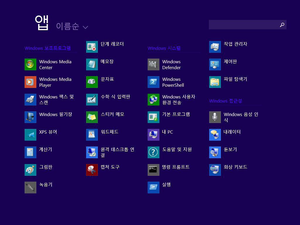 앱 목록입니다. 이쪽엔 메트로 UI에서 사용할 수 있는 앱들이 있습니다. 몇 개는 아직 한글화가 덜 된 모습입니다.