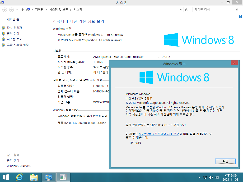 시스템 등록 정보입니다. 미디어 센터를 포함한 윈도우 8.1 프로 K 프리뷰 빌드 9431입니다. 빌드 넘버는 6.3.9431입니다.