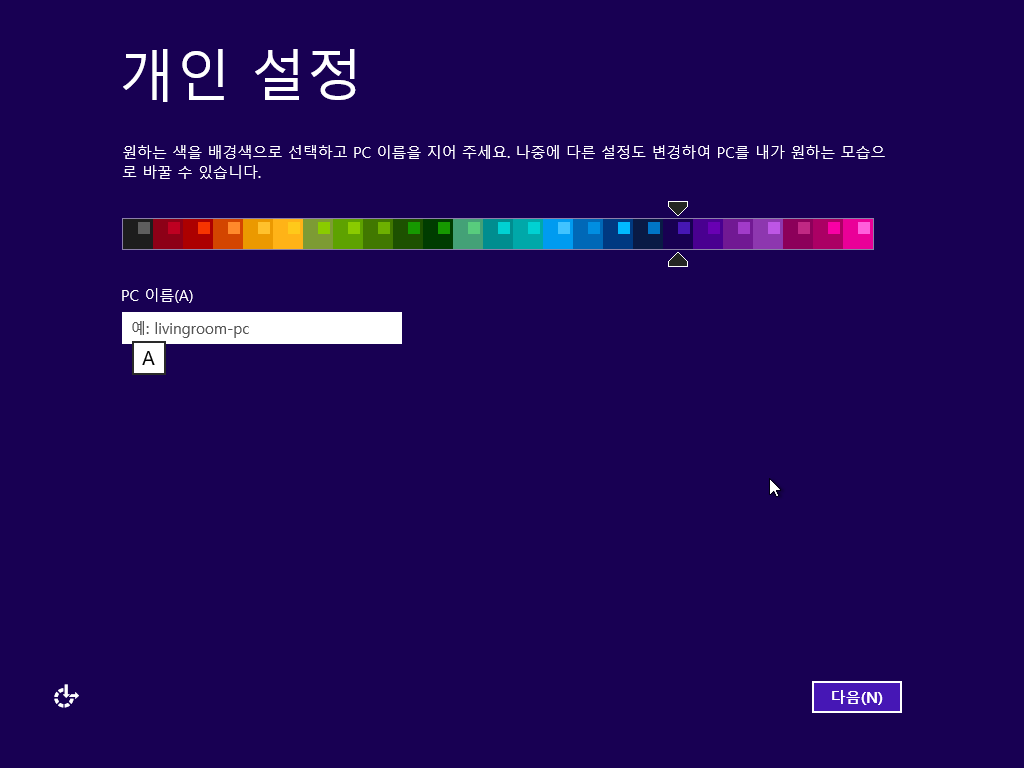 개인 설정입니다. 원하는 배경색과 PC 이름을 지정하고 다음을 누릅니다.