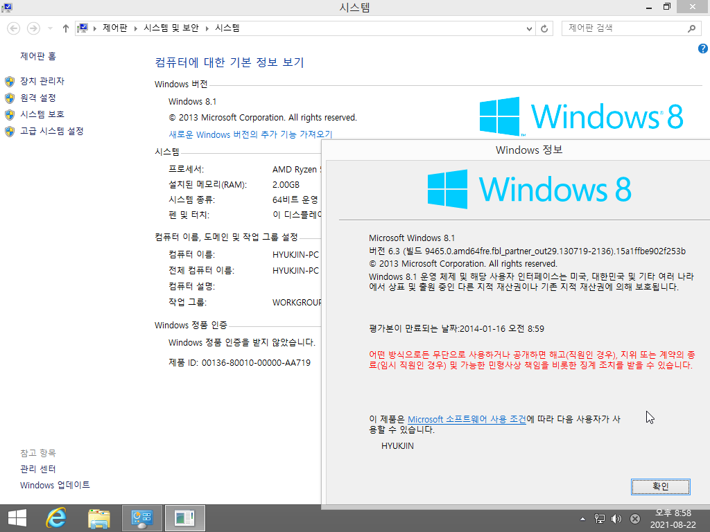 시스템 등록 정보입니다. 윈도우 8.1 빌드 9465입니다. 빌드 넘버는 6.3.9465입니다.