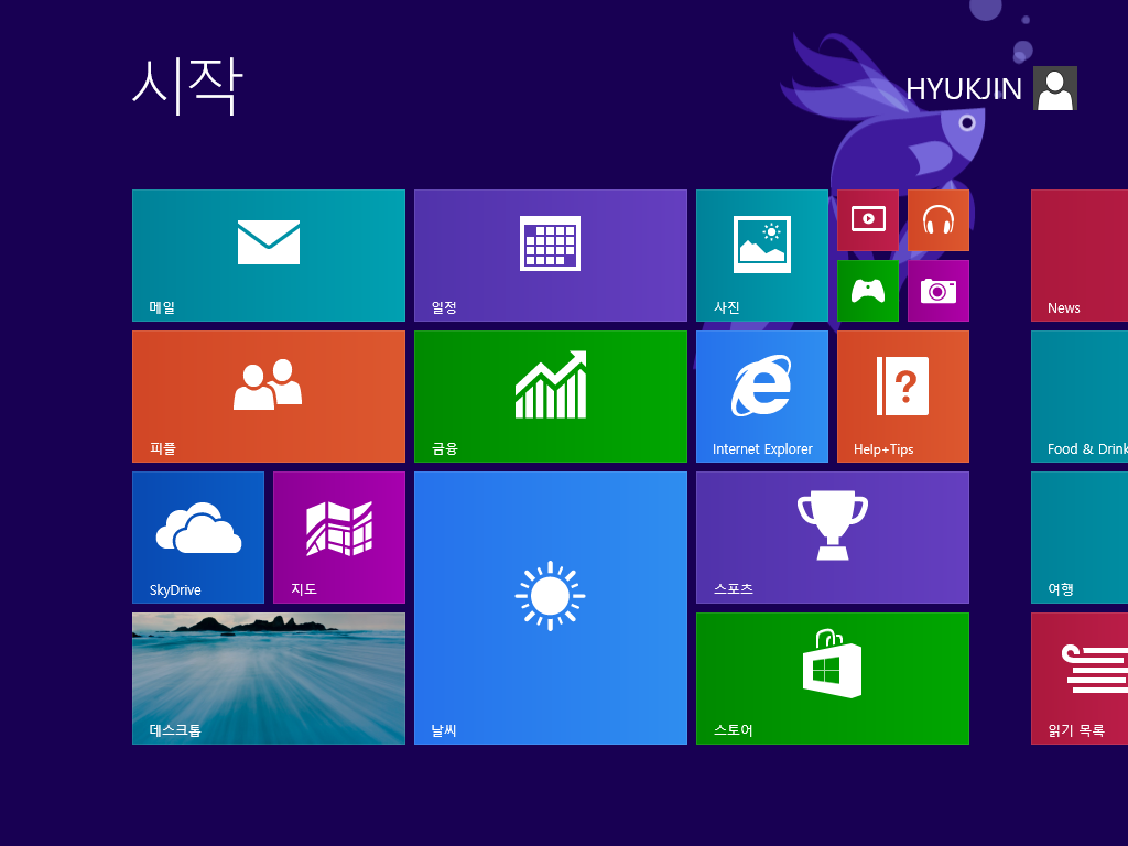시작 화면입니다. 메트로 UI가 적용되어 타일처럼 앱이 깔려있습니다.