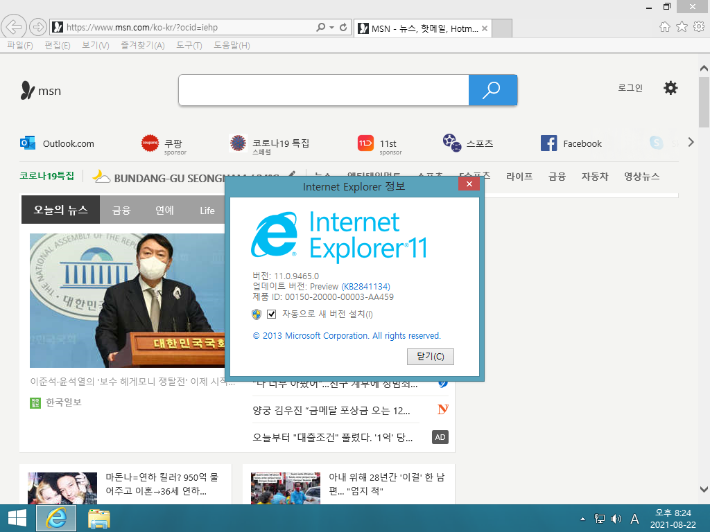인터넷 익스플로러입니다. 버전 11.0이고, 빌드 넘버는 11.0.9465.0입니다. 프리뷰 버전입니다.