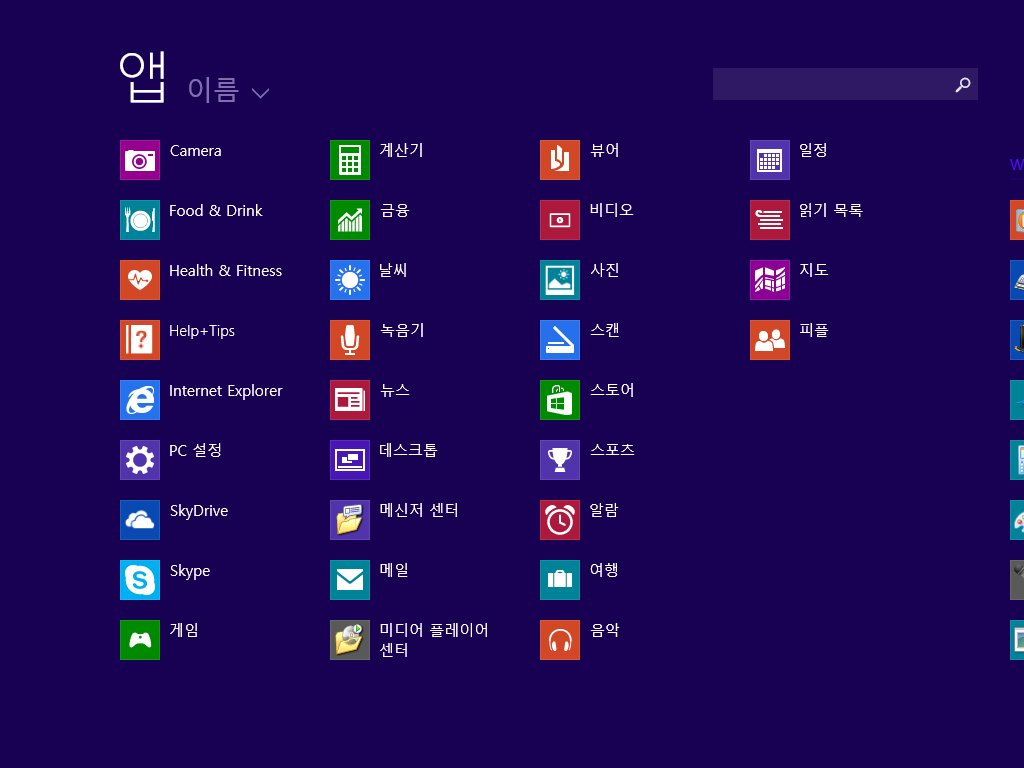앱 목록입니다. 메트로 UI에서 사용 가능한 앱들입니다. 몇 개는 한글화가 덜 된 모습입니다.