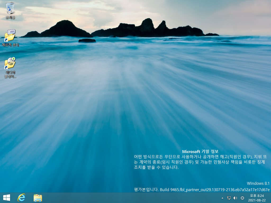 데스크톱 화면입니다. 이전 빌드와 같은 배경화면입니다. 시작 버튼은 여전히 메트로 UI로 넘어가는 버튼일 뿐입니다... 우측 하단에는 윈도우 8.1 빌드 9465라는 문구와 무단 사용을 금하는 경고 문구가 있습니다.
