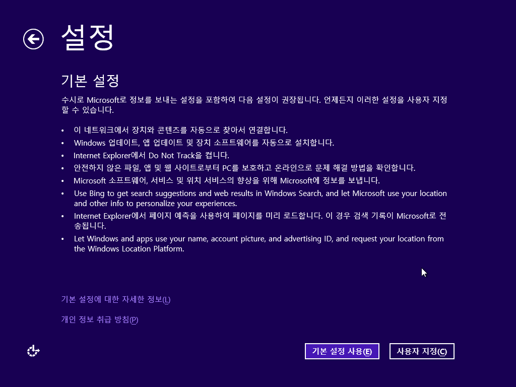 기본 설정을 합니다. 이전 빌드에서는 한글화가 되어있었는데 여기선 또 몇 개는 영어로 나오네요...