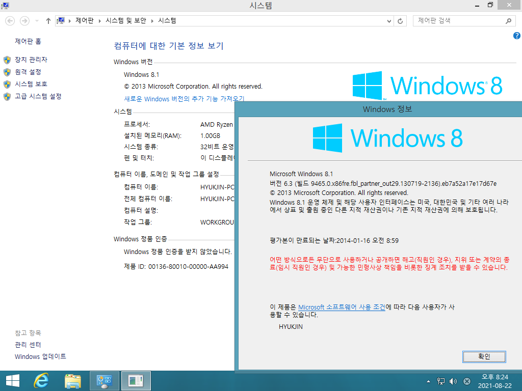 시스템 등록 정보입니다. 윈도우 8.1 빌드 9465입니다. 빌드 넘버는 6.3.9465입니다.