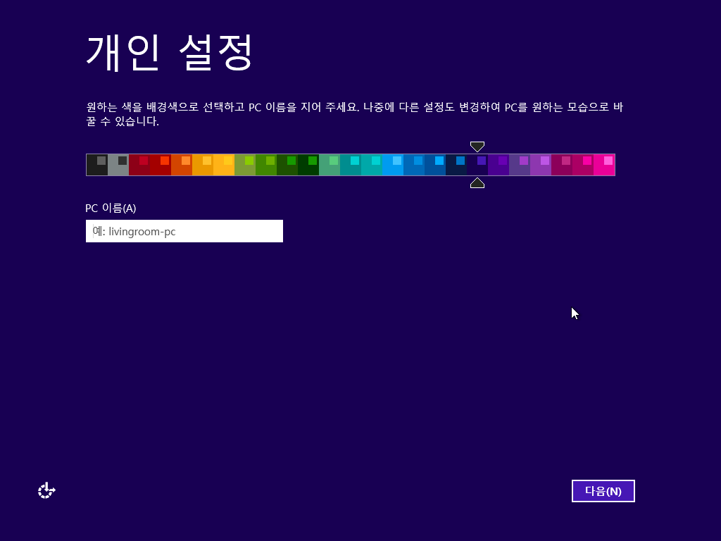 개인 설정입니다. 원하는 배경색과 PC 이름을 정하고 다음을 누릅니다.