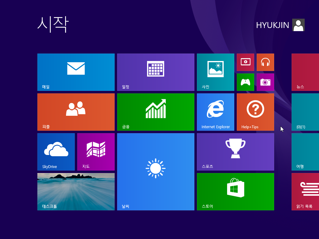 시작 화면입니다. 메트로 UI 화면입니다. 뒤에 배경에 베타피쉬가 사라지고 무늬가 새로운 걸로 바뀌었습니다.