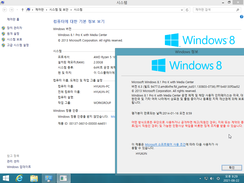 시스템 등록 정보입니다. 미디어 센터를 포함한 윈도우 8.1 프로 K 빌드 9477입니다. 빌드 넘버는 6.3.9477입니다.