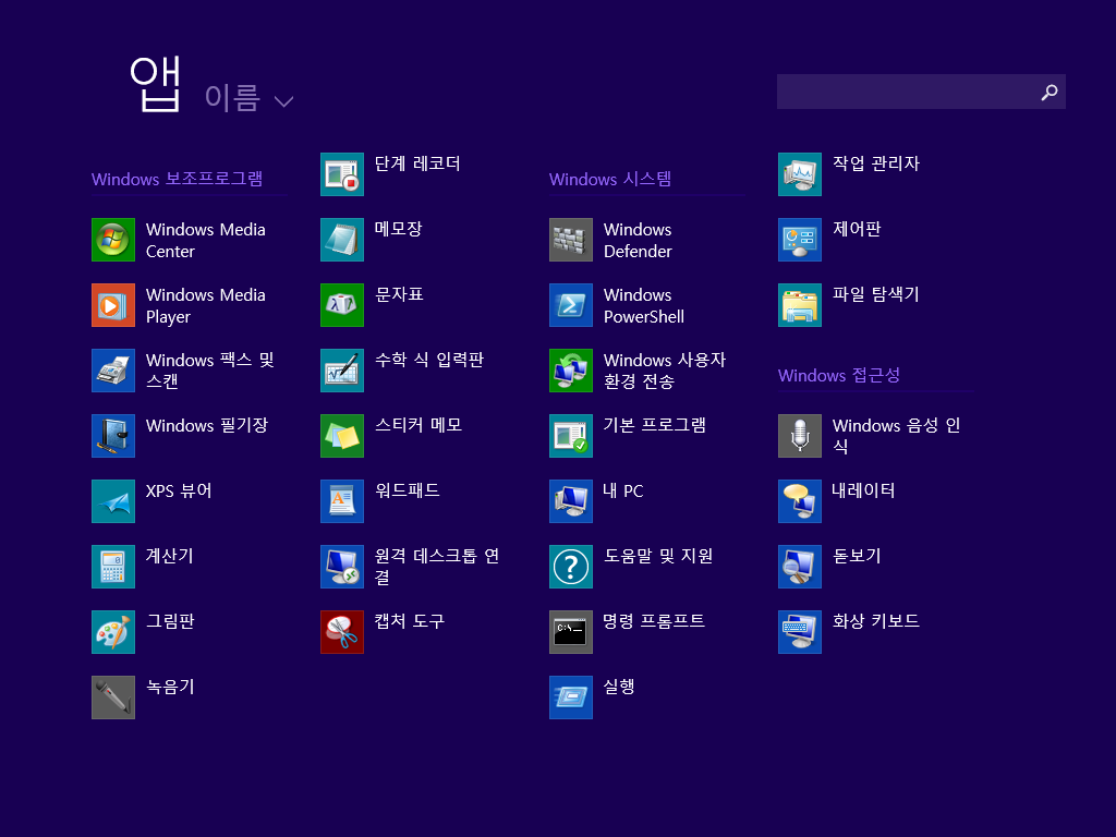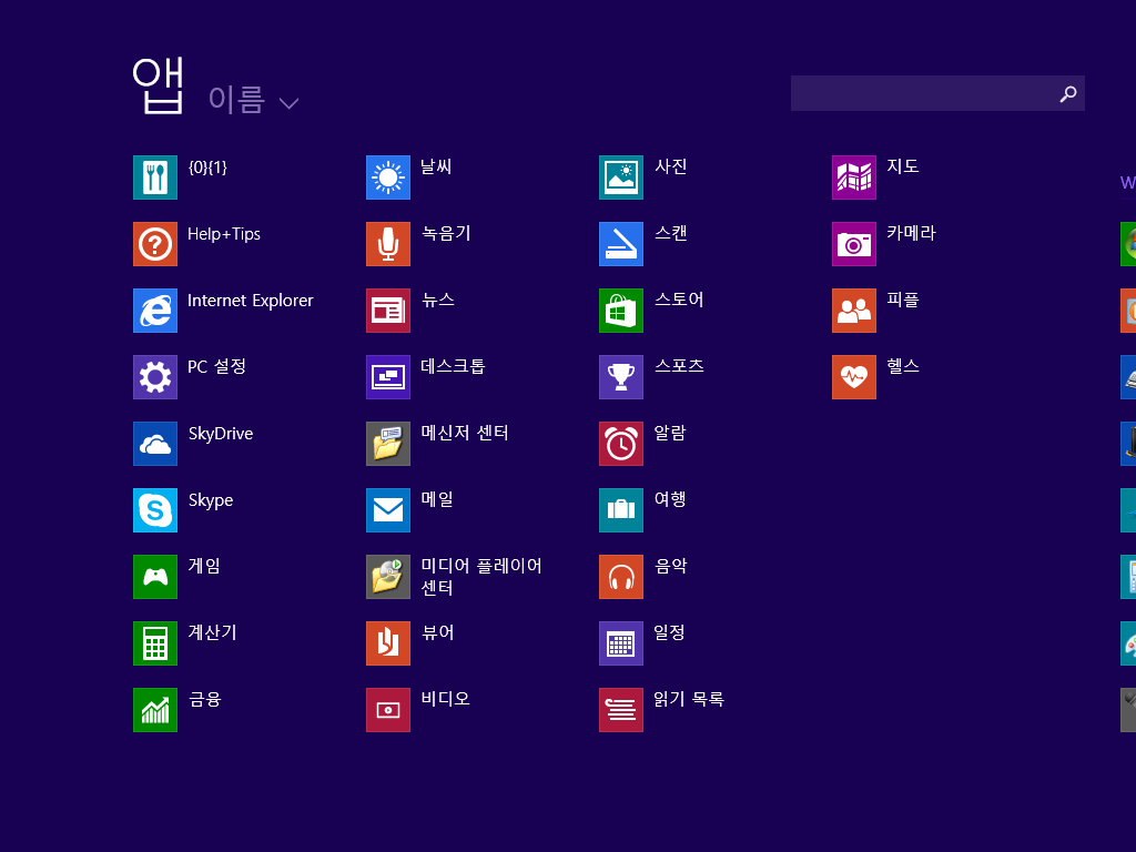 앱 목록입니다. 메트로 UI에서 사용 가능한 앱입니다. 몇 개는 아직 한글화가 덜 되어서 영문으로 나오네요.