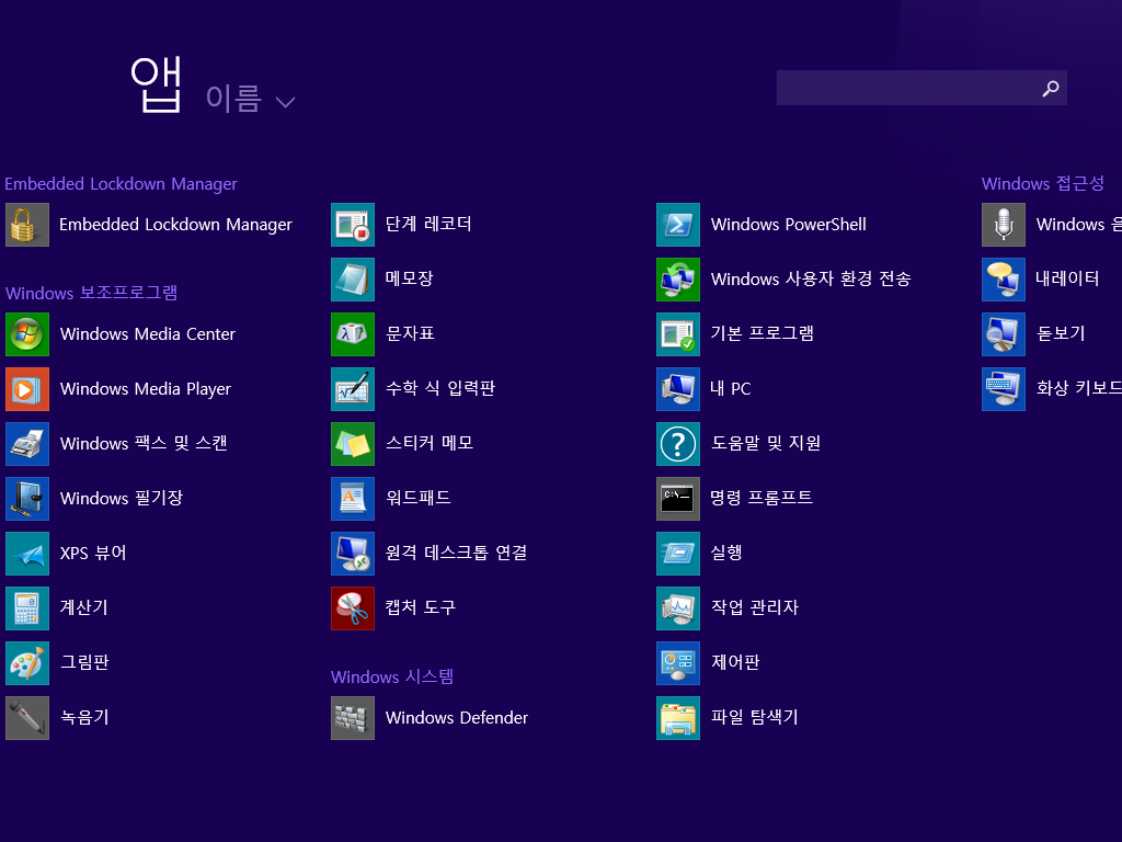 메트로 UI에서 사용 가능한 앱 목록입니다. 초성별로 분류가 되어있군요.