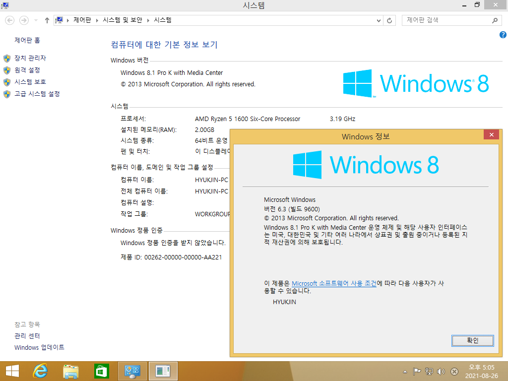 시스템 등록 정보입니다. 미디어 센터를 포함한 윈도우 8.1 프로 K입니다. 빌드 넘버는 6.3.9600입니다.