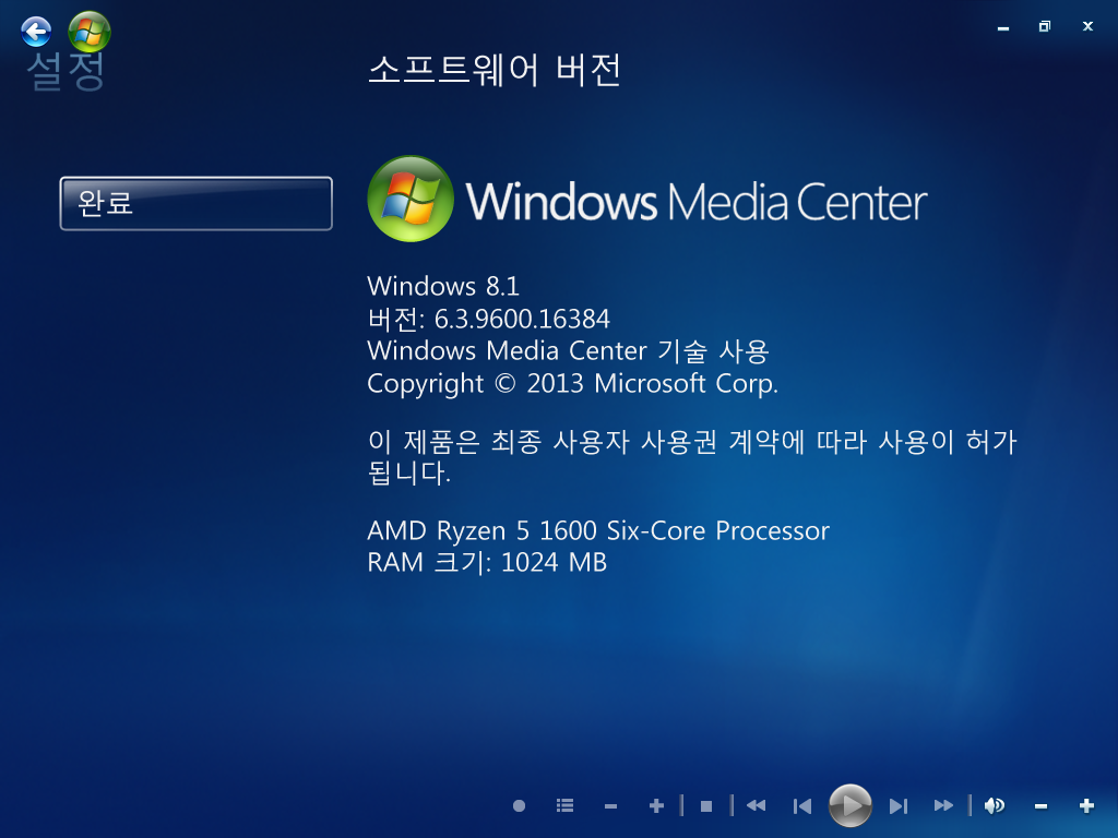 미디어 센터 정보입니다. 빌드 넘버는 6.3.9600.16384입니다.