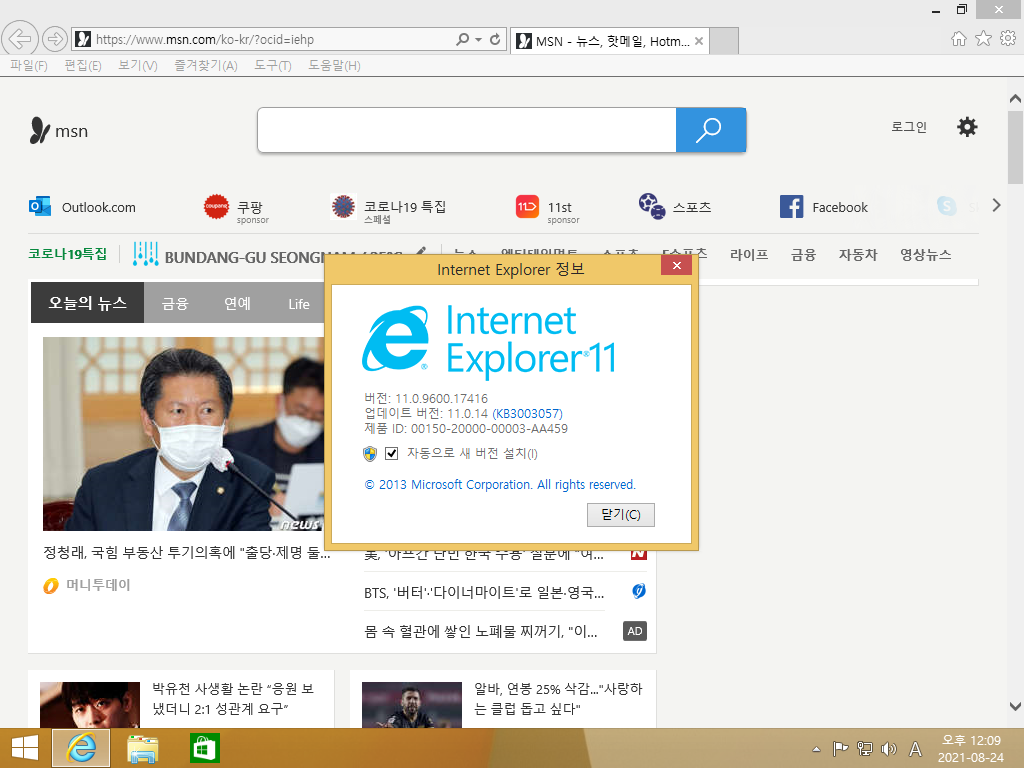 인터넷 익스플로러입니다. 버전 11.0이고, 빌드 넘버는 11.0.9600.17416입니다.
