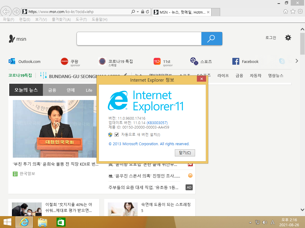 인터넷 익스플로러입니다. 버전 11.0이고, 빌드 넘버는 11.0.9600.17416입니다.