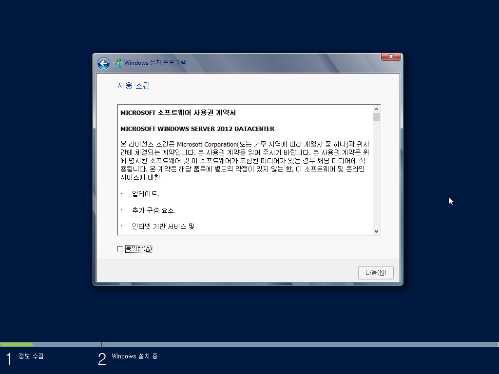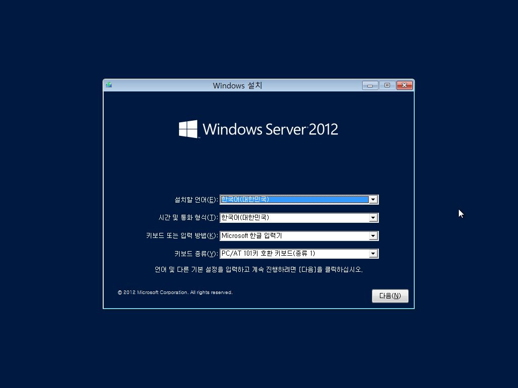 윈도우 서버 2012 설치를 시작합니다. 다음을 누릅니다.