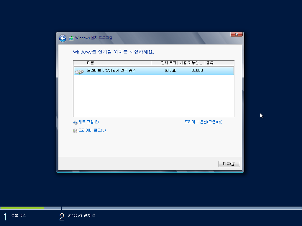 윈도우를 설치할 공간을 선택합니다.