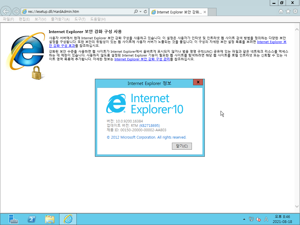 인터넷 익스플로러입니다. 버전 10.0이고, 빌드 넘버는 10.0.9200.16384입니다.